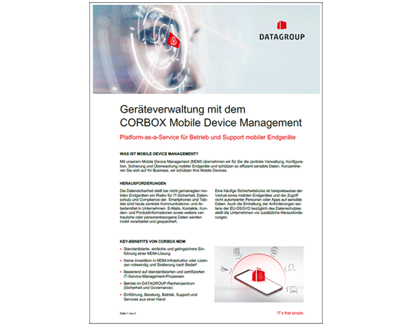 Mit dem DATAGROUP Mobile Device Management bieten wir eine zentrale Verwaltung aller mobilen Geräte. In Abhängigkeit von der Smartphone-Plattform (iOS oder Android) und der Version des Betriebssystems können Sie über unser MDM Geräte registrieren und automatisch richtlinienbasiert konfigurieren lassen.