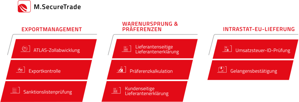 Die M.SecureTrade Suite realisiert die effiziente Abwicklung aller Außenhandelsgeschäfte in den Bereichen Exportmanagement, Warenursprung und Präferenzen, Intra-EU-Lieferungen und Außenhandelsadministration.
