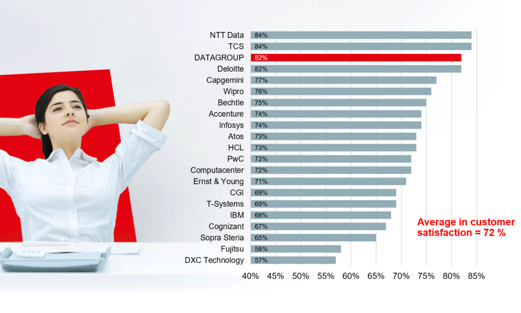 For the IT Outsourcing Study Germany, 160 outsourcing customers were surveyed, who together hold around 550 outsourcing contracts and around 300 cloud sourcing contracts. The study is thus the most comprehensive study of the IT outsourcing market in Germany. DATAGROUP ranks third among all providers with an average customer satisfaction of 82%. The average customer satisfaction of all providers in the study is 72%. DATAGROUP thus occupies the third place in the customer satisfaction ranking and for the sixth time in a row one of the top places.