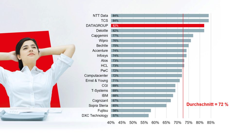 Das spiegelt sich auch in den Studienergebnissen wider. 72% der DATAGROUP-Kunden sind so zufrieden, dass sie im Falle einer Vertragsverlängerung direkt mit DATAGROUP verhandeln würden anstatt einen Ausschreibungsprozess zu starten.