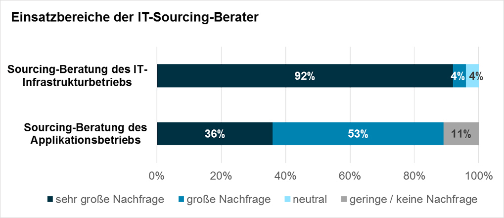 Die Cloud ist zugleich die zentrale technologische Basis für die digitale Transformation der Geschäftsprozesse – ein weiterer wichtiger Treiber des Marktes. Zum einen suchen Unternehmen mit Hilfe von Beratern nach Dienstleistern, die sie bei der Anpassung von IT und Geschäftsprozessen unterstützen und die Applikationslandschaft weiterentwickeln. Zum anderen müssen die Firmen durch das Outsourcing von Betriebsdienstleistungen aber auch Freiheiten für die internen IT-Spezialisten schaffen, damit die sich auf strategische Themen und Herausforderungen der Digitalisierung konzentrieren können. 96% der Berater erarbeiten für ihre Kunden Strategien für den Infrastrukturbetrieb, 89% für den Applikationsbetrieb.