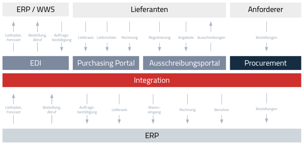 Zwei Systeme die bei der Beschaffung von direkten und indirekten Materialien, sowie von Dienstleistungen unterstützen – Das Purchasing Portal zum Datenaustausch mit Ihren Lieferanten und für die Koordination der Angebotsabgaben durch Ihre Lieferanten.