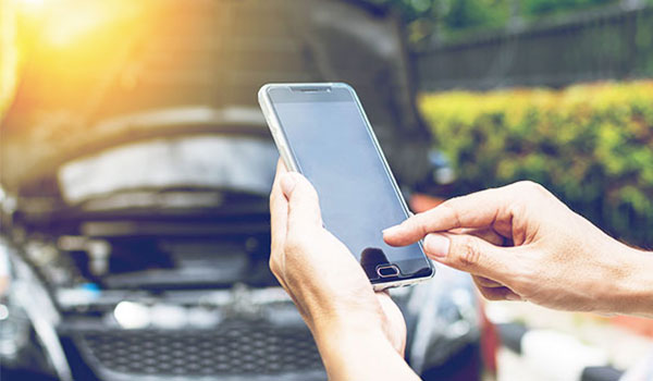 Person mit Handy in der Hand steht vor Auto mit geöffneter Motorhaube